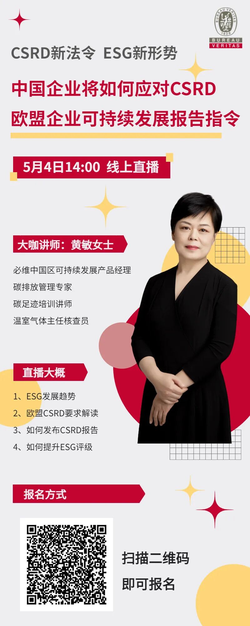 为了协助在欧发展的中国企业应对CSRD实施定所带来巨大的挑战,必维可持续专家黄敏女士将在5月4日带来线上直播,为您详细解读,应对CSRD为企业带来的挑战!