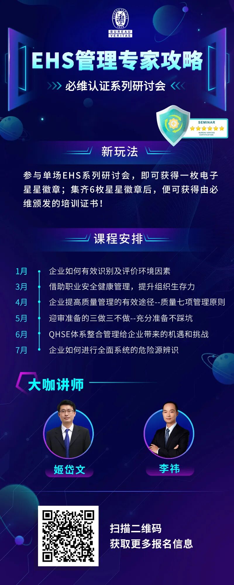 延续老规矩,只需要参与单场EHS系列研讨会,即可获得一枚电子星星徽章;集齐6枚星星徽章后,便可获得由必维颁发的培训证书,还不抢先报名预定席位?