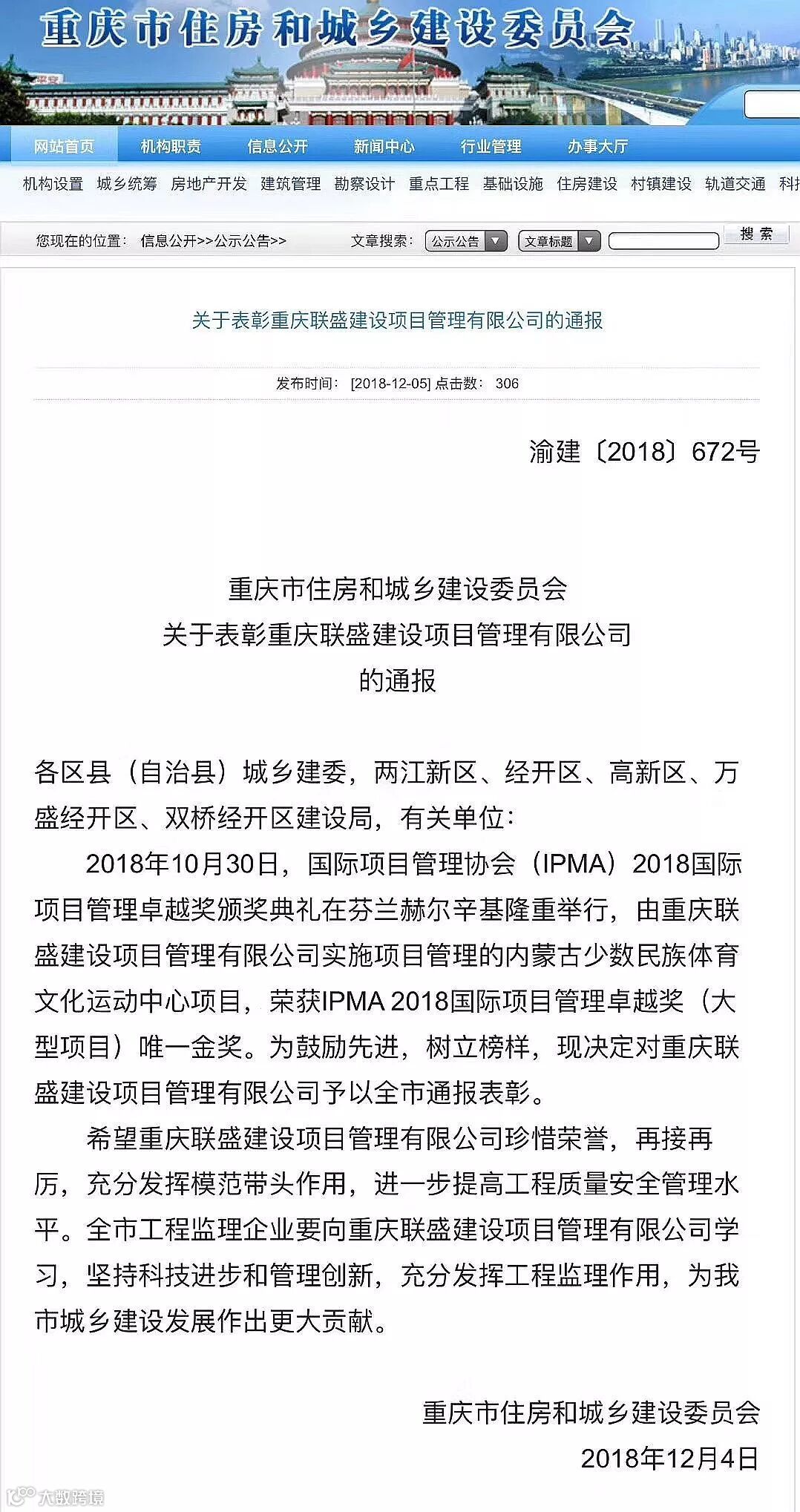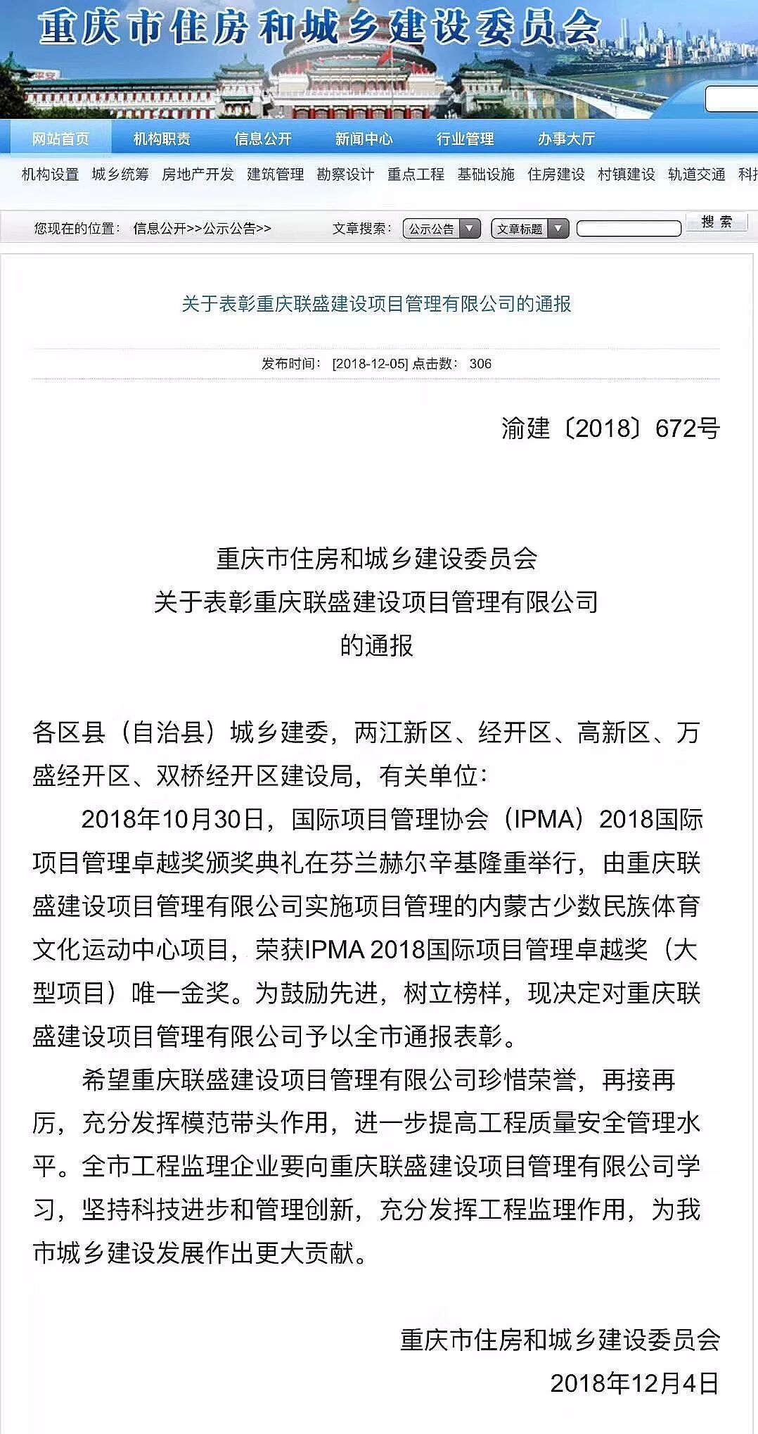 近日,重庆市住房和城乡建设委员会发布了“关于表彰重庆联盛建设项目管理有限公司”的通报。就必维重庆联盛公司实施项目管理的内蒙古少数民族体育文化运动中心项目,荣获IPMA 2018国际项目管理卓越奖(大型项目)唯一金奖,为鼓励先进,树立榜样,现决定对重庆联盛建设项目管理有限公司予以全市通报表彰。