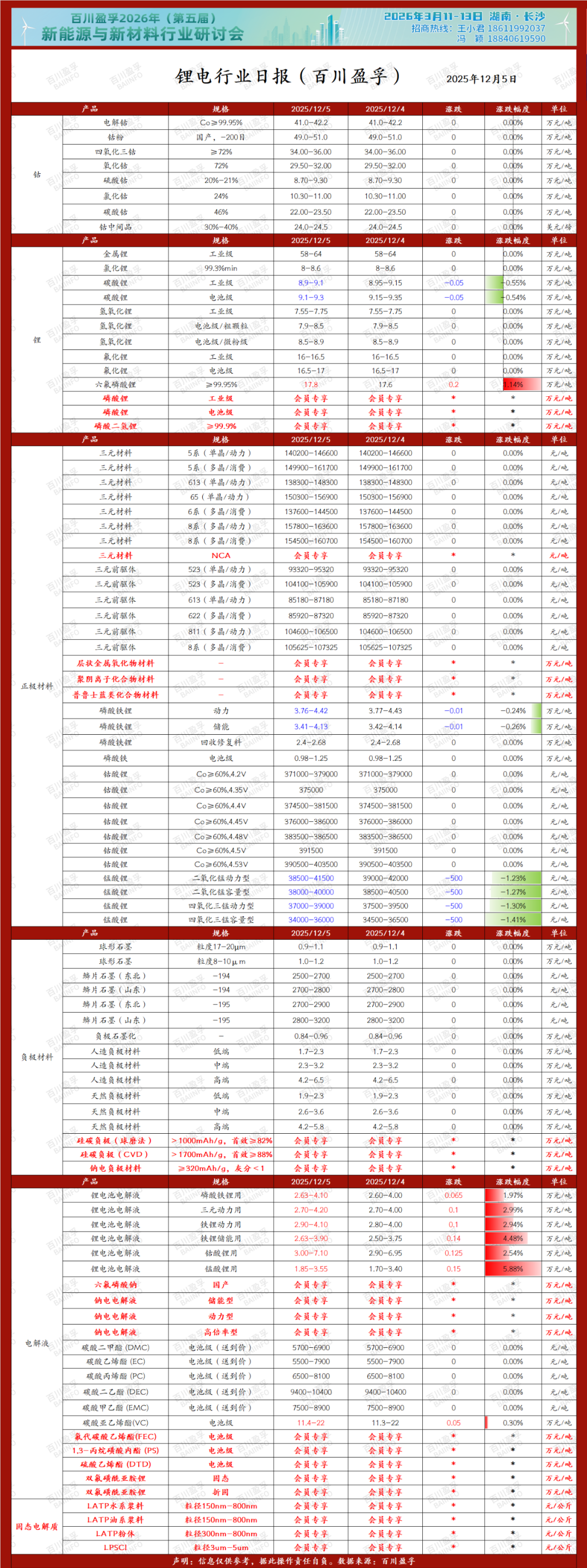 百川盈孚 | 2025年12月5日锂电行业日报 百川盈孚大宗商品参考价格发布