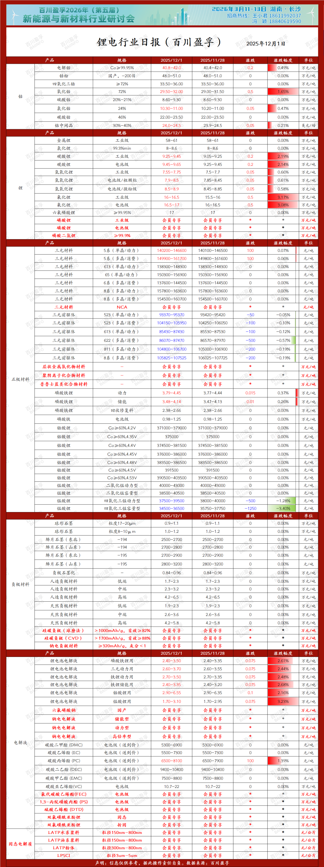 百川盈孚 | 2025年12月1日锂电行业日报 百川盈孚大宗商品参考价格发布