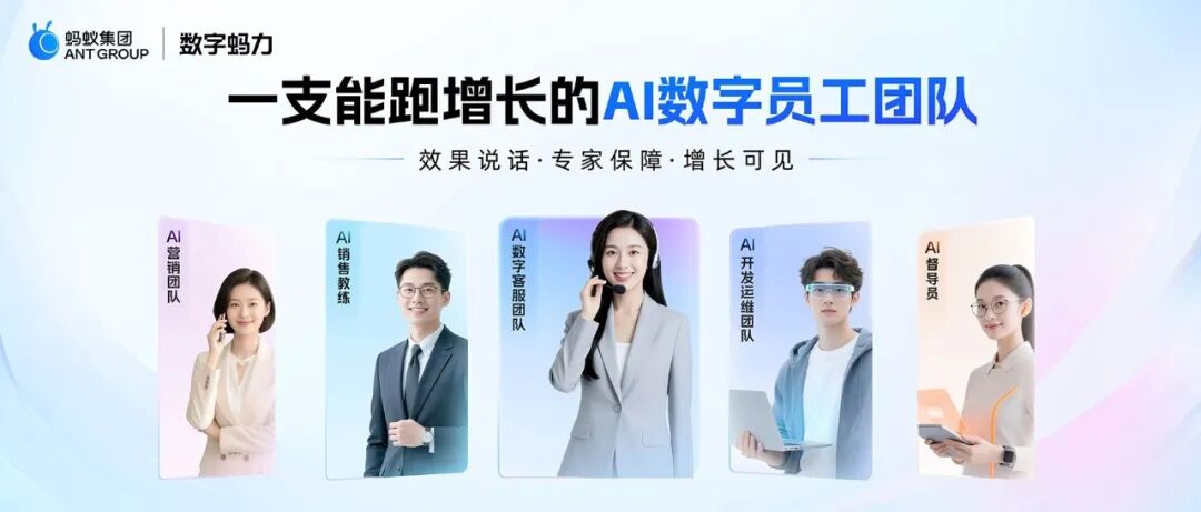 在新的生产关系下,人与数字员工不再是单独作战,而是组成一支能为业务增长负责的团队。数字蚂力发布的五大数字员工团队——AI数字客服团队、AI营销团队、AI销售教练、AI督导员与 AI研发运维团队,覆盖了企业最常见也最头疼的职能,它们并不只是“替人干活”,不仅与人类共同带来增长,还进一步通过业务托管模式,对结果负责。