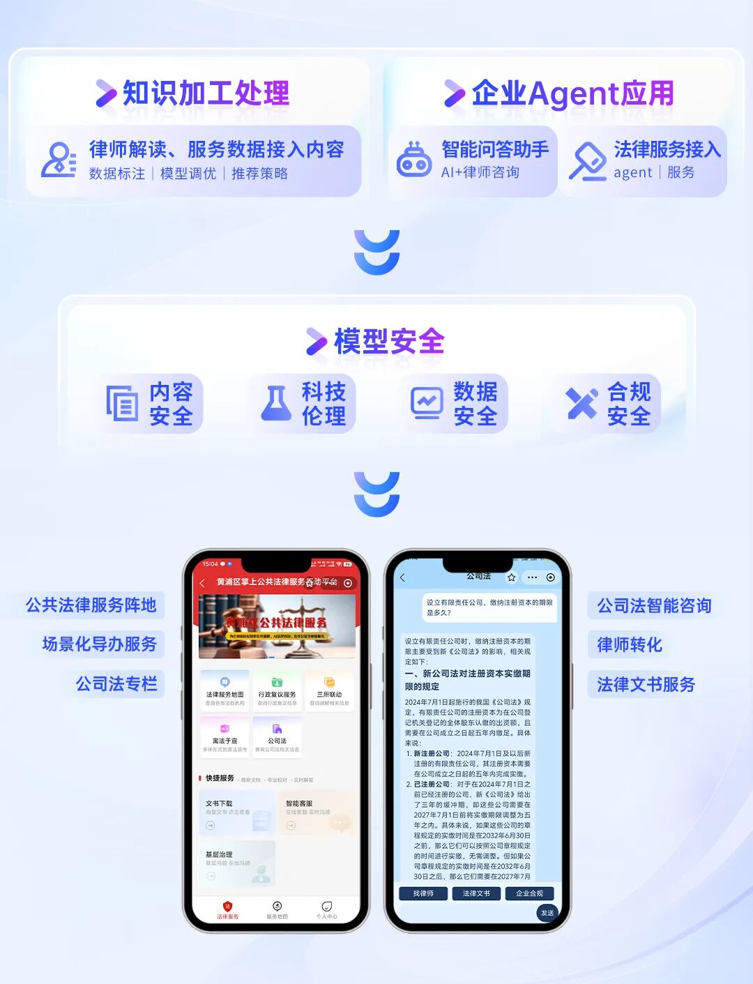 具体而言,通过对法律大数据集(包括法律条文、司法案例、法律法规等)进行二次训练和指令微调,将专门的法律知识融入模型,形成了具备解决法律特定任务能力的生成式AI。
