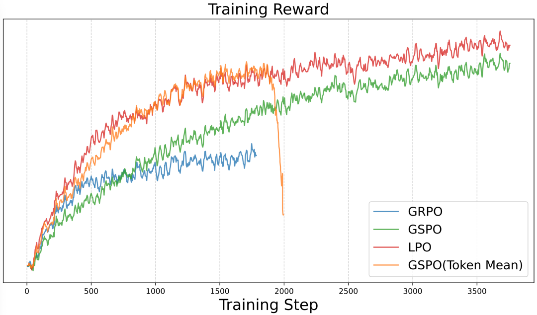 在强化学习阶段,我们提出了以“句子”为粒度的策略优化方法 LPO(Linguistics-Unit Policy Optimization)。当前主流的强化学习算法将每个词元(如GRPO)或整个生成序列(如GSPO)作为独立动作进行优化,这可能会带来语义的过度碎片化、或奖励信号的过度平滑。我们发现,对于推理任务而言,句子是更符合语义逻辑的动作单元。为此,LPO 首次将“句子”作为一种兼顾语义完整性与粒度精细度的中间策略,并在此粒度上进行重要性采样与裁剪,使得奖励信号与模型行为在语义层面实现了更精准的对齐。如下图所示,与 GRPO 和 GSPO 相比,LPO 在训练稳定性与模型泛化性上均表现出明显优势。