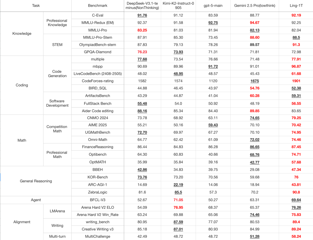 Ling-1T在部分权威基准评测的表现(红色加粗代表Top1,黑色加粗下划线表示Top2)