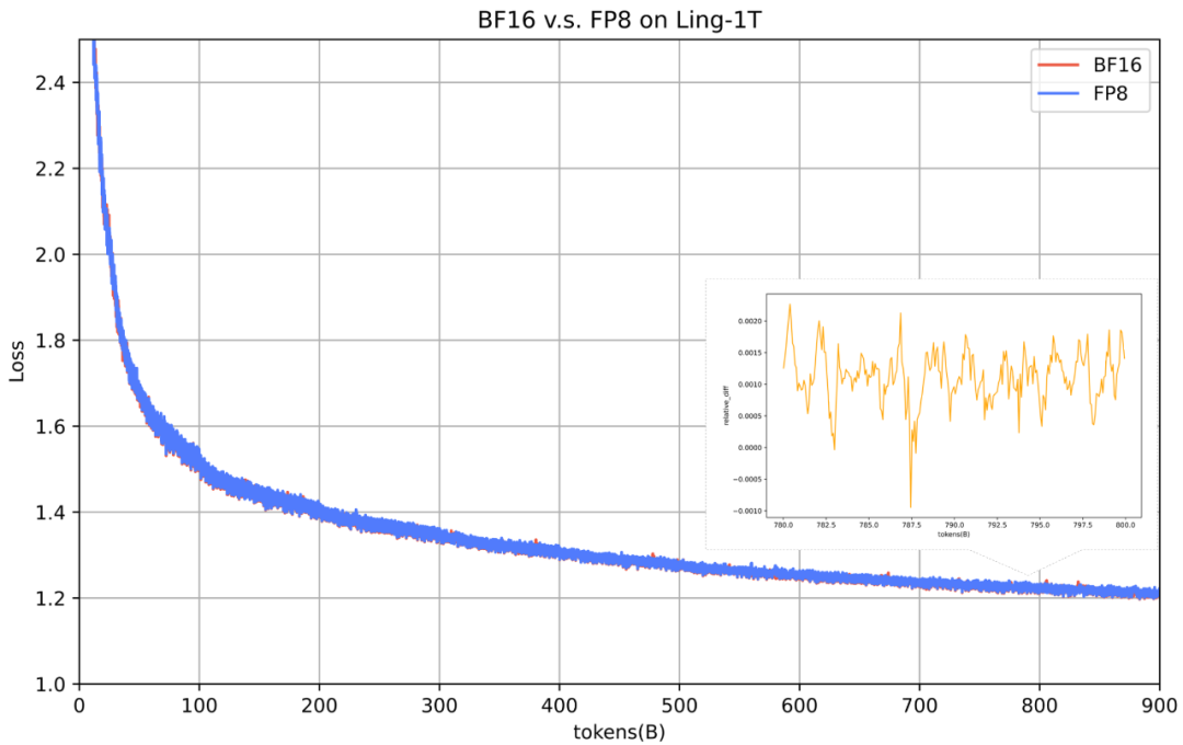 Ling-1T 全程采用 FP8 混合精度训练(部分技术已开源),是目前已知规模最大的使用 FP8 训练的基座模型。这一设计为训练带来了显著的显存节省、更灵活的并行切分策略和 15%+ 的端到端加速。我们在接近 1T token 的训练量上,对 FP8 与 BF16 训练进行了系统对比,结果显示二者 Loss 偏差仅约 0.1%,验证了 FP8 训练在万亿级规模下的稳定性与可靠性。由于 Ling 2.0 的层间异构架构(Embedding、Dense、MoE、MTP、Loss 等)导致流水线负载不均,我们将 interleaved 1F1B pipeline 改进为 异构细粒度pipeline,实现了更精细的流水线编排与更低的空泡率,带来 40%+ 的端到端加速。此外,我们在 算子融合、通信优化、重计算、Checkpoint 存储、仿真训练 与 细粒度监控 等方面进行了系统性优化,为万亿级基座的高效稳定训练提供了全面保障。其中大量设计思路和技术方案源自开源社区,我们也将持续回馈 Ling-1T 训练过程中的工程经验与优化实践,推动社区共建。