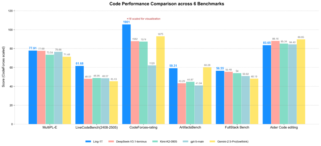 为了全面评估 Ling-1T 的综合推理能力,我们选择了几款具有代表性的旗舰模型作为参考,包括大参数量的开源模型(DeepSeek-V3.1-Terminus、Kimi-K2-Instruct-0905)与闭源 API(gpt-5-main、Gemini-2.5-Pro)。在代码生成、软件开发、竞赛数学、专业数学、逻辑推理等多项高难度基准测试上,Ling-1T 均展现出领先的复杂推理能力与全面优势。