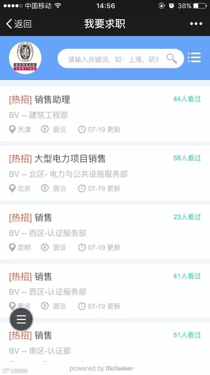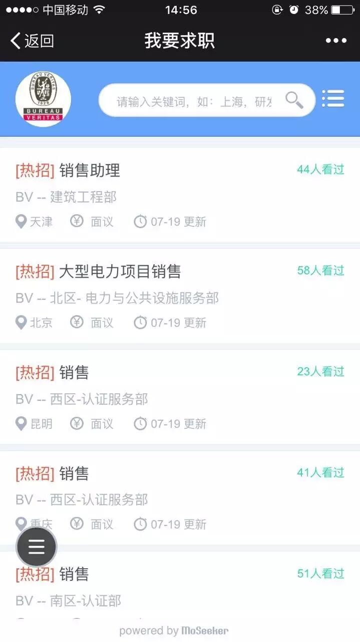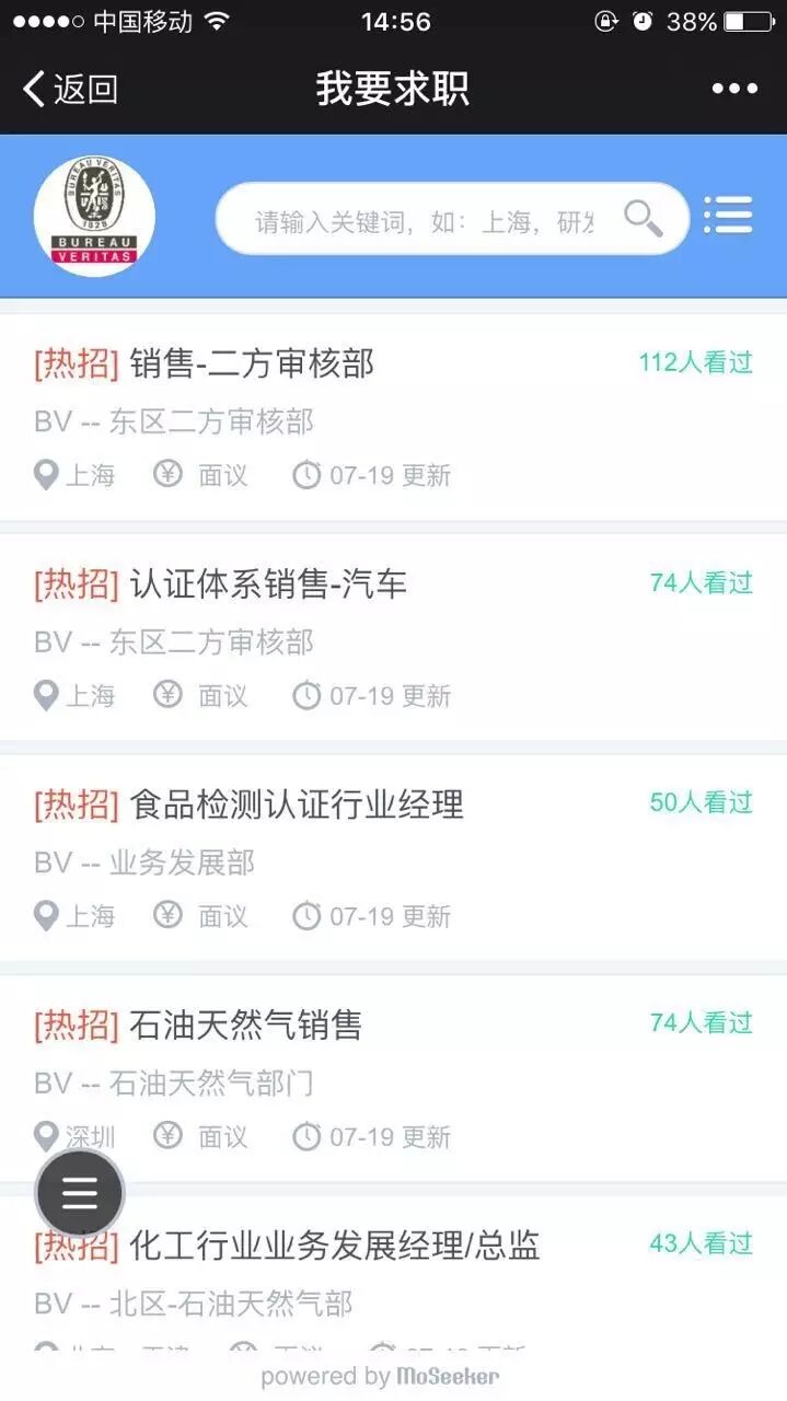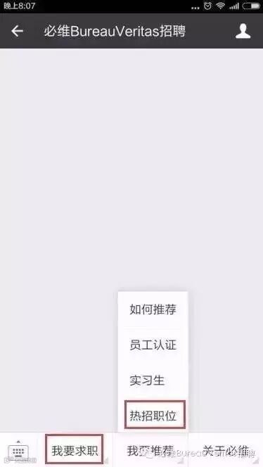 进入并点击“热招职位”,进入必维招聘专栏或者直接点击“我要求职”,选取你所向往的职位