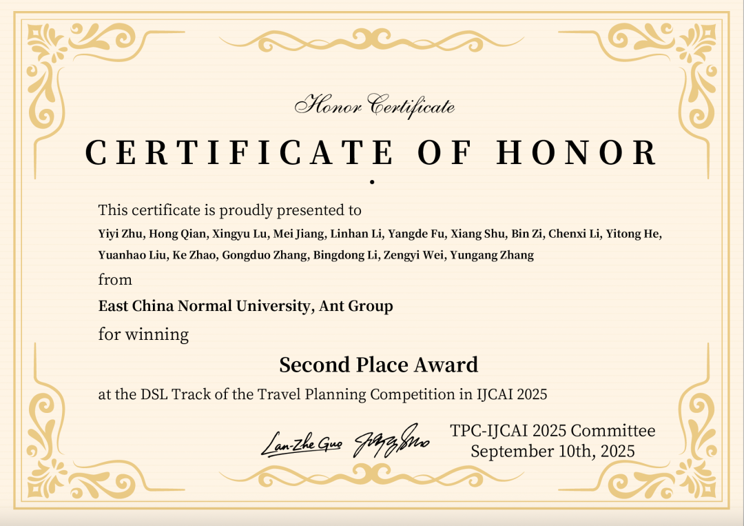 支付宝行业技术部、蚂蚁集团基础智能技术团队,联合华东师范大学钱鸿老师和李丙栋老师团队在第 34 届人工智能国际联席会议[1](IJCAI-2025)自主旅行行程规划挑战赛[2]中,基于自研的“大模型+优化求解”技术完成用户旅行行程规划需求,夺得 Original OS Track(原始自然语言组)赛道冠军、DSL Track(带约束条件组)赛道亚军。