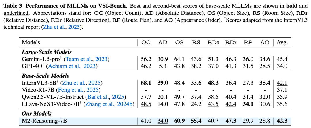 在更具挑战性的、基于视频的VSI-Bench基准上,M2-Reasoning的平均分达到42.3,超越了 InternVL3-8B(42.1),仅次于闭源的Gemini-1.5-pro(45.4)。尤其值得一提的是,它在“房间大小估算”(Room Size)和“相对方向判断”(Relative Direction)这两个极具挑战性的细分任务上创造了新的 SOTA 记录,充分证明了其在动态场景下强大的空间想象与分析能力。