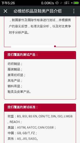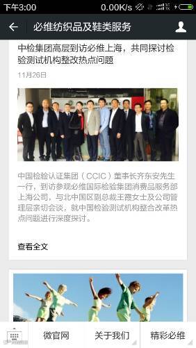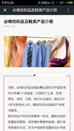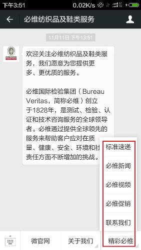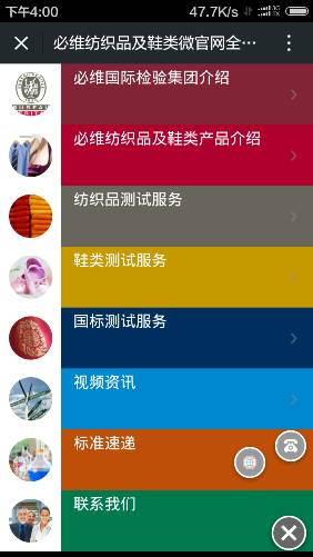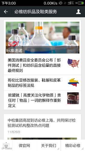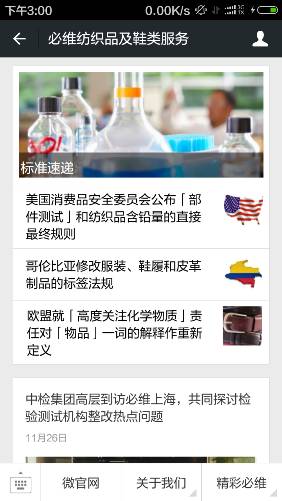 “必维检测纺织品及鞋类”公众号菜单栏导航