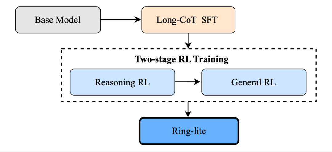 为全面提升Ring-lite的模型能力,我们设计了Two-staged RL pipeline。首先是Long-CoT SFT让base模型学会思考,接下来通过可验证奖励的RLVR来提升推理能力,之后加入RLHF阶段来提升模型的通用能力。我们验证了直接融合RLVR+RLHF的联合训练和Two-staged RL, 两种方式在我们的实验中效果差异不大。 但由于RLVR和RLHF的问题难度不一致,RLHF的思维链长度相对较短,放在一起训练会有较多等待长尾现象,从工程效率角度,本次发布使用了Two-staged RL方案。