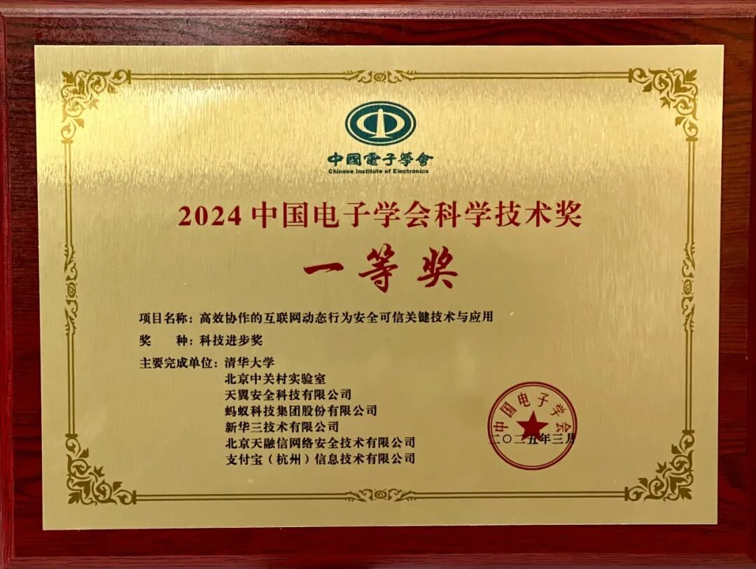 4月19日,2024年度中国电子学会科学技术奖在第十八届中国电子信息年会揭晓并颁奖,由清华大学、北京中关村实验室和蚂蚁集团等单位共同完成的联合项目《高效协作的互联网动态行为安全可信关键技术与应用》荣获科技进步奖一等奖。