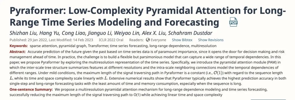 ICLR 2022 会议项目主席对这篇Oral的评价是:作者提出了一种用于捕捉时间序列预测中长程依赖的多分辨率金字塔注意力机制,实现了线性的时间和空间复杂度。作者们进行了广泛的实验和消融研究,证明了所提出方法始终优于现有最佳水平,并为架构的各个组成部分提供了依据。他们还提供了理论证明,保证了长序列编码的线性复杂度,并充分回应了审稿人提出的问题。作者额外进行的基准测试进一步展示了该方法的卓越性能。所有审稿人都认为这项工作对该领域做出了扎实的贡献。