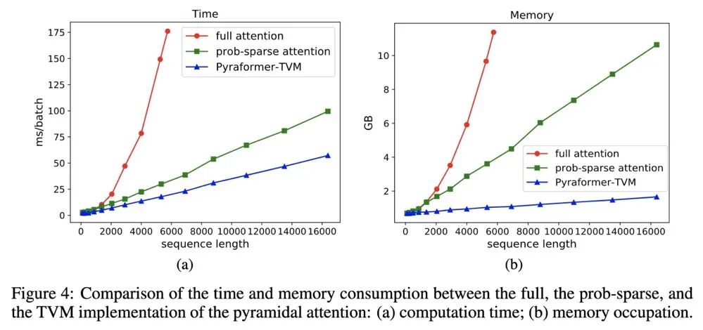 为横轴,画出了二者随序列长度的变化。这里我们只比较了Informer[4]中的prob-sparse注意力机制、全连通注意力机制和PAM。