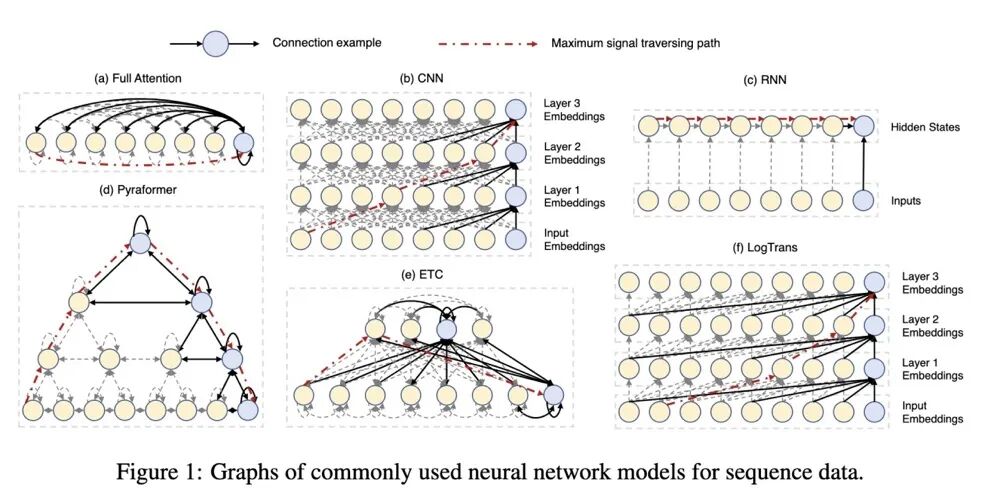 不幸的是,现有的最先进方法未能同时实现这两个目标。一方面,RNN和CNN实现了与时间序列长度L线性的时间复杂度,但它们的最长信号穿越路径为O(L),因此难以学习远距离位置之间的依赖性。另一方面,Transformer显著将最长路径缩短为O(1),但代价是时间复杂度增加到O(L²)。因此,它无法处理非常长的序列。为了在模型容量和复杂度之间找到折衷,提出了Transformer的变体,例如Longformer、Reformer和Informer。然而,很少有方法能够在显著降低时间和空间复杂度的同时,将最长路径长度缩短到小于O(L)。