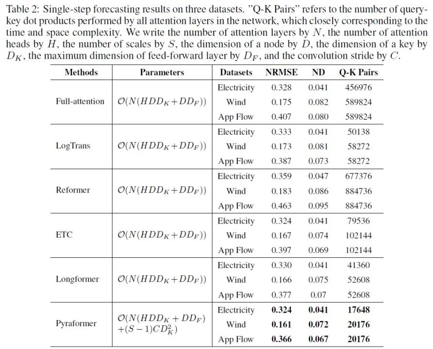 Pyraformer中的Q-K对最少,这表明Pyraformer的时空复杂度较低。值得注意的是,Pyraformer的Q-K对比LogTrans少65.4%,比Full-attention少96.6%。