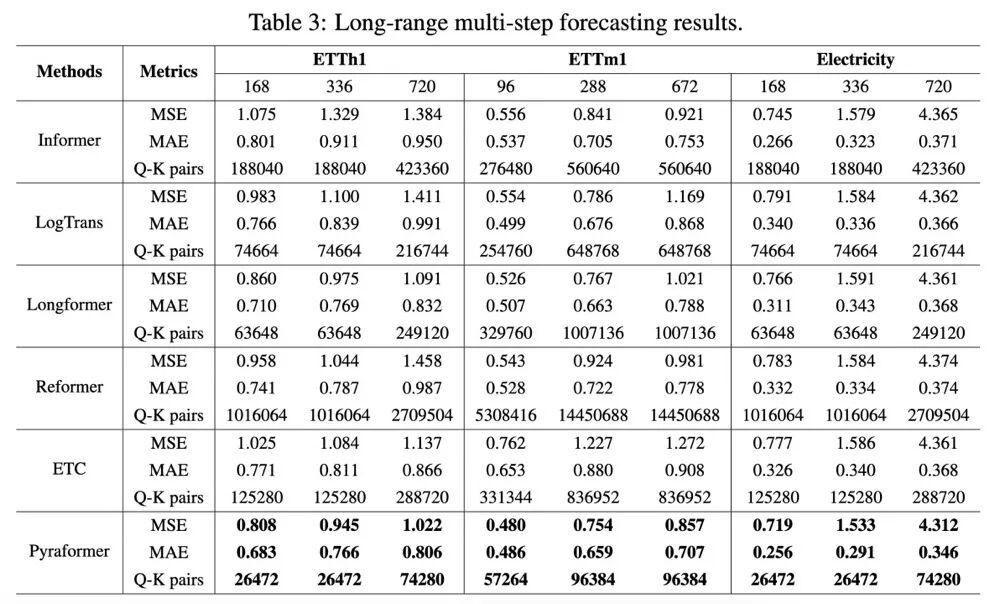 我们在三个数据集上评估了Pyraformer的长程预测性能,包括Electric,ETTh1,和ETTm1。对于ETTh1和ETTm1,我们进行的是多元时序预测,同时预测了未来油温和电力负荷等共7个特征。 我们将2.3节中提出的两个预测模块装配到所有模型上进行了测试,并在表3中列出了最好的结果。