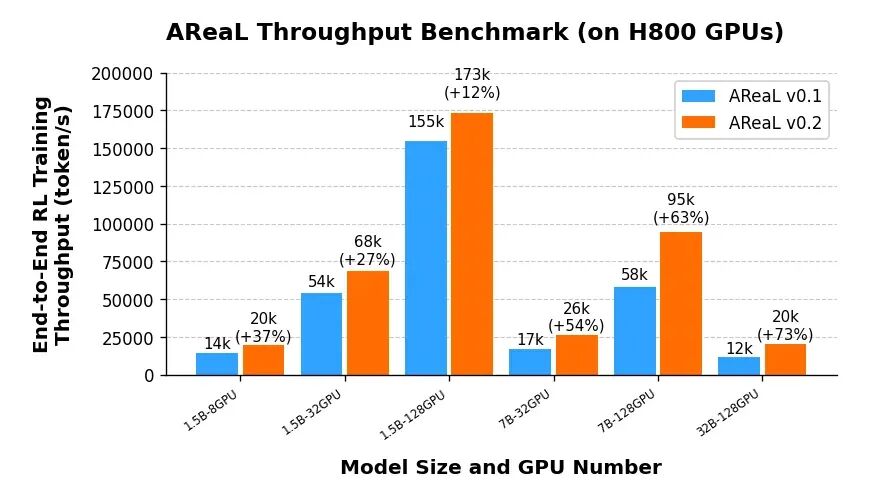 极速训练吞吐:集成 xAI 公司采用的 SGLang 框架,对比初代系统在 1.5B/7B/32B 模型上分别提升 35%/60%/73% 训练速度;