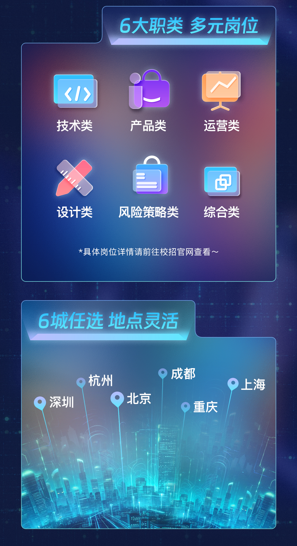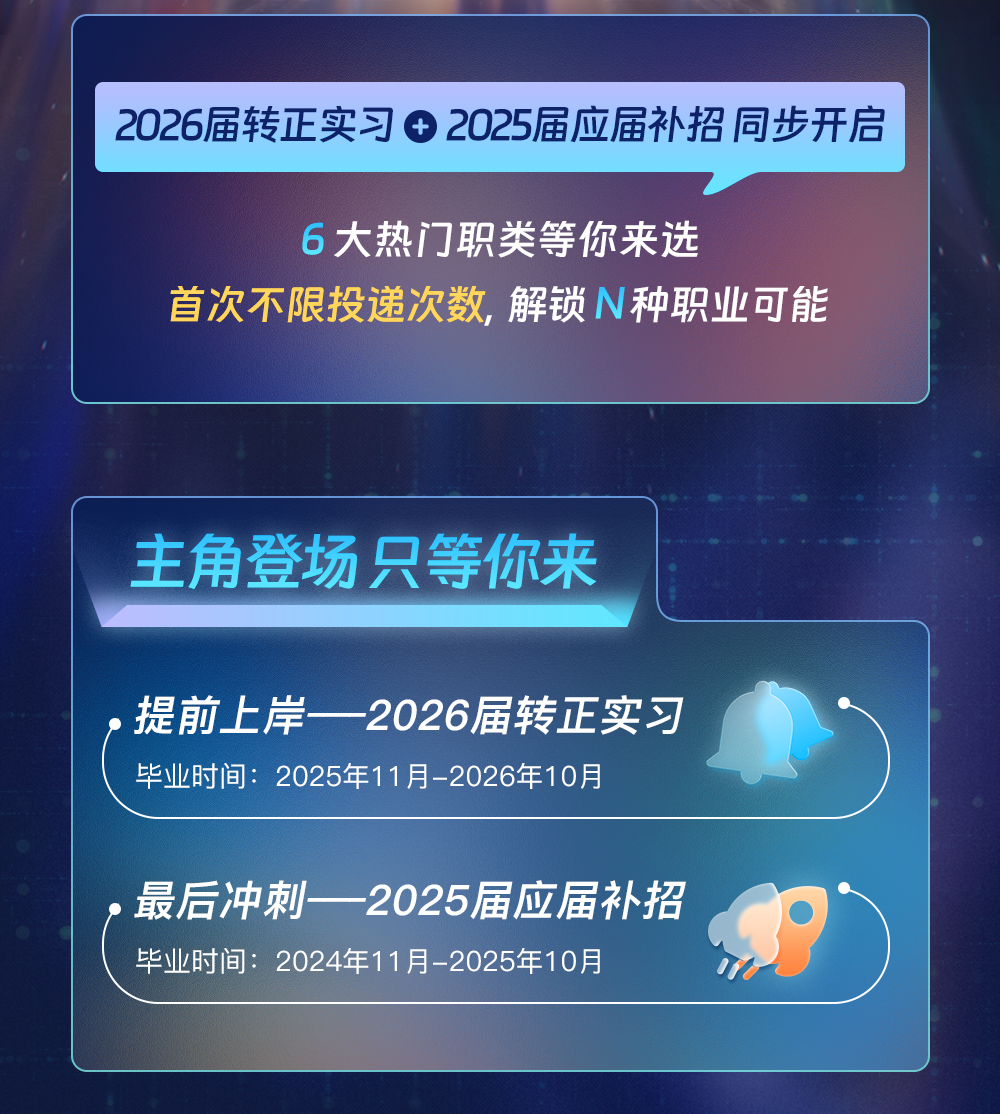 本次春招面向 2026 届实习生和 2025 届应届生,开放了技术类、产品类、运营类、设计类、风险策略类和综合类共 6 大职类 1000 多个岗位,工作地覆盖杭州、北京、上海、深圳、成都、重庆 6 个城市。