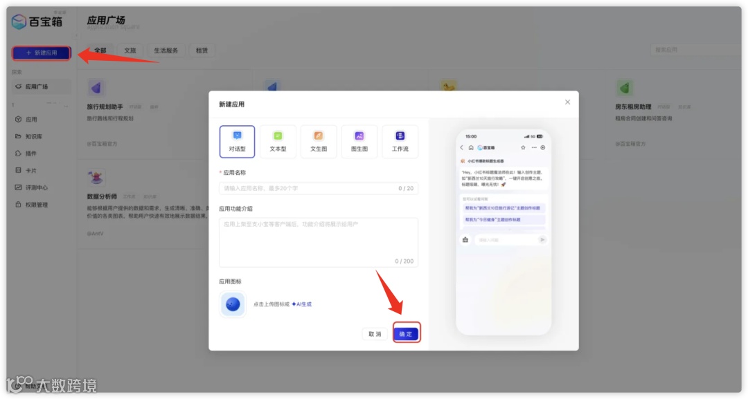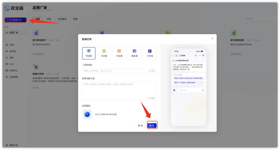 ❷ 进入主页面后,点击【新建应用】,填写应用名称和介绍,点击【确定】新建。