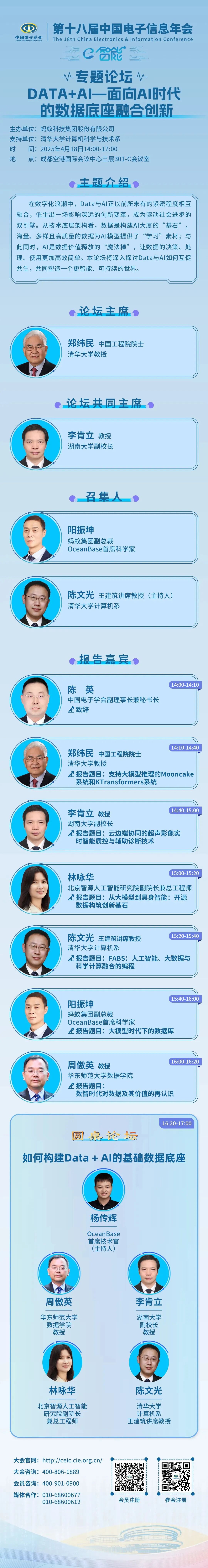 2025年4月18日下午,“DATA+AI——面向AI时代的数据底座融合创新”专题论坛将在成都空港国际会议中心重磅启幕!论坛由蚂蚁集团倾力承办、清华大学计算机系学术加持,特邀中国工程院院士郑纬民与湖南大学副校长李肯立担任共同主席,携手周傲英(华东师范大学数据学院教授)、林咏华(北京智源人工智能研究院副院长兼总工程师)、陈文光(清华大学计算机系王建筑讲席教授)以及蚂蚁集团OceanBase首席科学家阳振坤、杨传辉等学界与产业界领军者,共探数据与AI融合的底层逻辑与前沿实践。