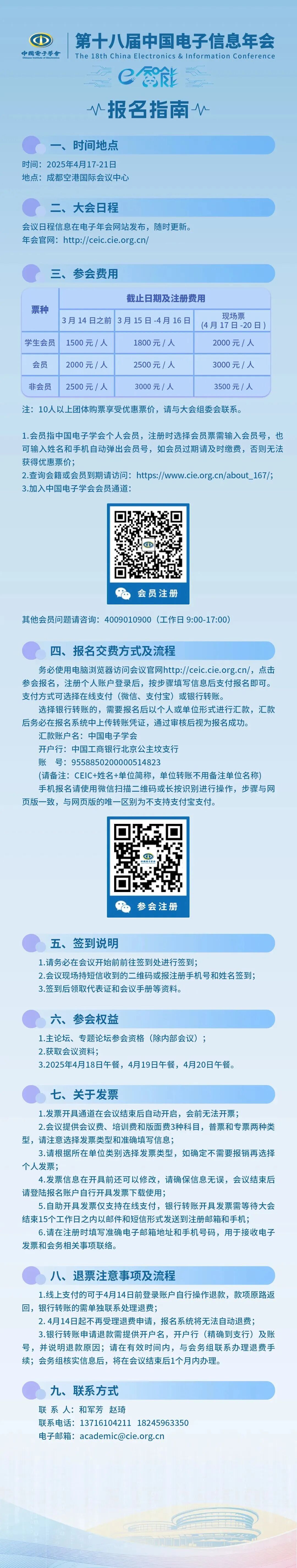 第十八届中国电子信息年会将于2025年4月17-21日在成都空港国际会议中心举办。本次年会以“e智能”为主题,汇聚60余位两院院士,设置2场主论坛和60余场专题论坛,同期举行中国电子学会科学技术奖励大会。