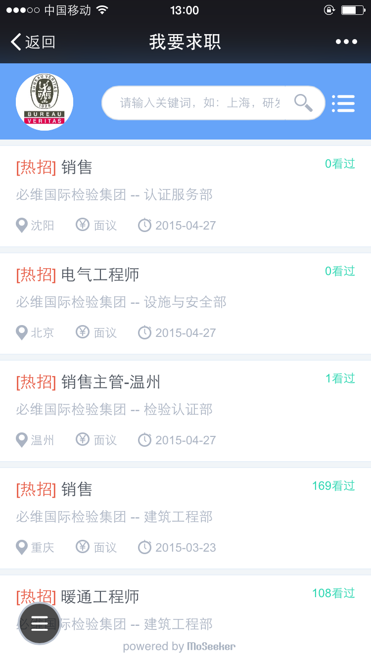 2. 点击自定义菜单“加入必维”进入“职位列表”界面