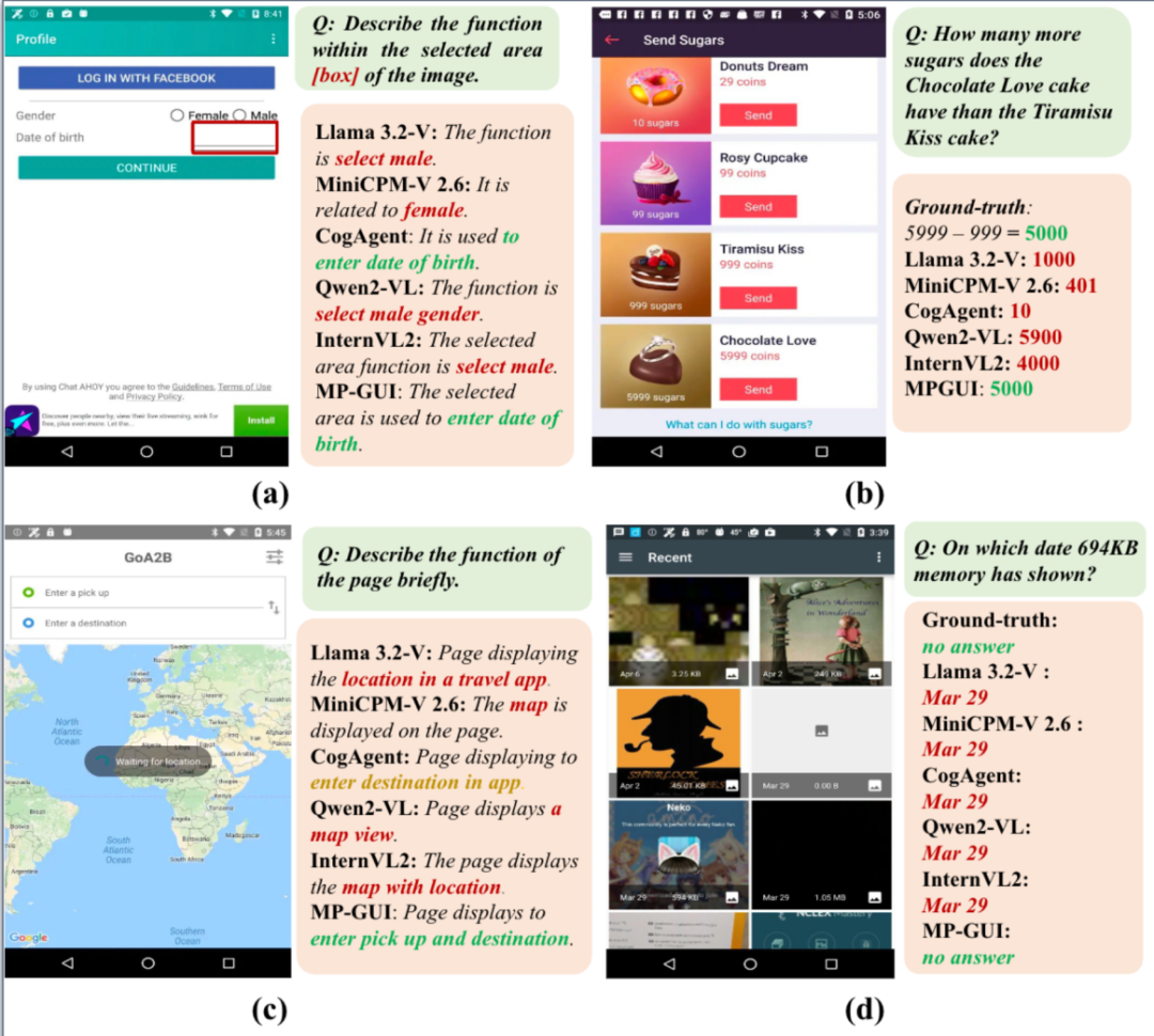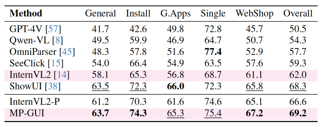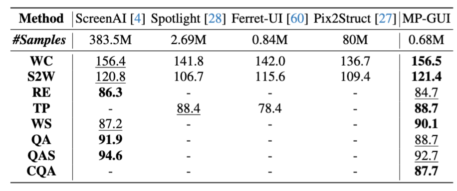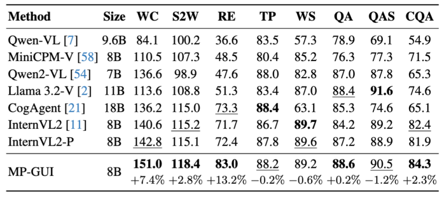 通过广泛的基准测评,我们验证了MP-GUI的先进性,尤其是对屏幕中细粒度视觉元素的定位和理解以及元素间空间上下午的感知,并发现通过对增强MLLM对屏幕中的GUI感知与理解能力,能够进一步提升各种下游任务的性能。