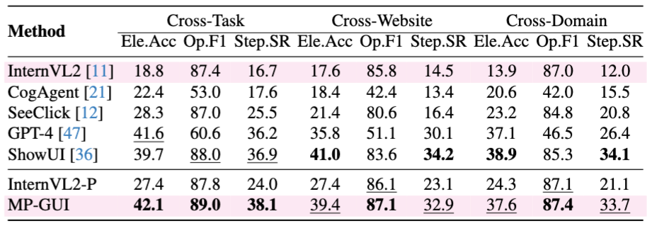 MP-GUI在screen navigation基准上的性能对比(AITW/Mind2Web):