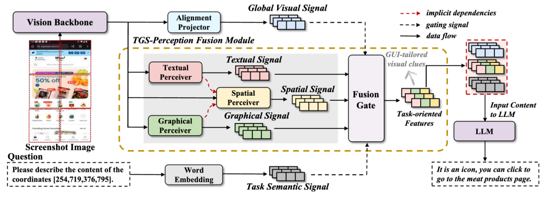 为了应对这些挑战,本研究提出了MP-GUI算法,旨在全方位增强MLLM的GUI理解能力。MP-GUI通过三个不同的GUI感知器来分别提取屏幕中的文本信号、图形信号和元素之间的空间关系信号,并利用一个由语义引导的动态融合门控模块,实现GUI信号的有效融合。在通用视觉线索的基础上为LLM提供额外的GUI定制视觉线索(GUI-tailored visual clues),从而增强MLLM的GUI感知能力,带动各种下游任务的性能提升。
