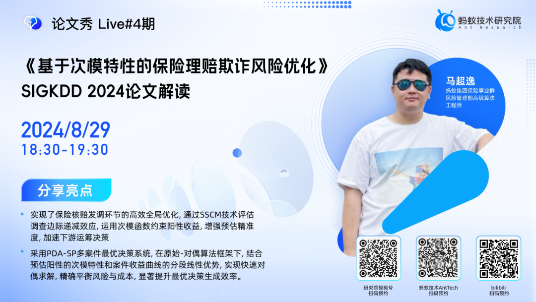 我们邀请到本文作者之一、蚂蚁保险事业群高级算法工程师马超逸来解读这篇论文。本期“论文秀Live#4”线上直播活动定于2024年8月29日18:30至19:30进行,邀您观看。