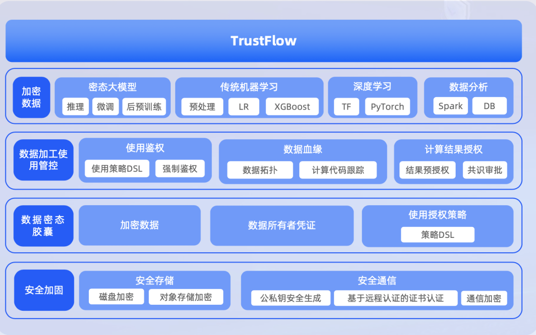TrustFlow是一个可信易用的数据流通计算框架,确保数据流转过程中的隐私性和安全性。TrustFlow提供了一套完整的数据加工使用跨域管控能力,保护数据在流转过程中被正确安全地使用。同时,TrustFlow提供了丰富的开箱即用应用,囊括大模型、机器学习、深度学习、数据分析等。