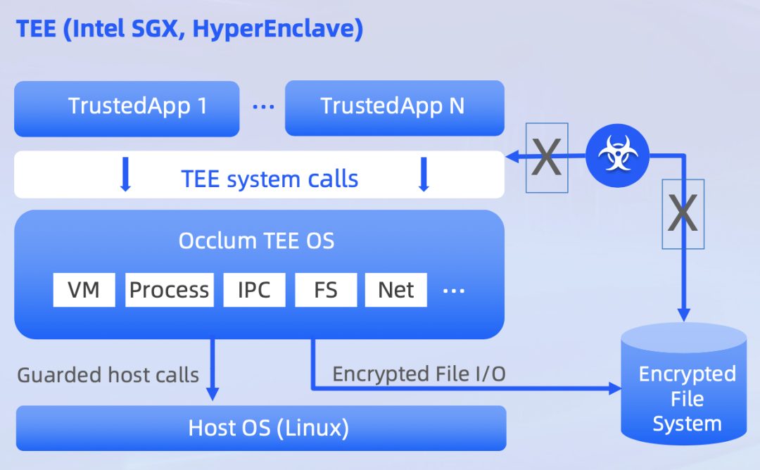 Occlum是蚂蚁集团开源的TEE库操作系统,也是CCC(机密计算联盟)第一个由中国公司发起的开源项目。它是业界第一个采用内存安全语言Rust开发的TEEOS,为TEE应用提供了一个兼容Linux的运行环境,使得Linux应用程序无需修改或者少量修改就可在TEE环境中运行,极大降低了业务应用适配难度和成本。