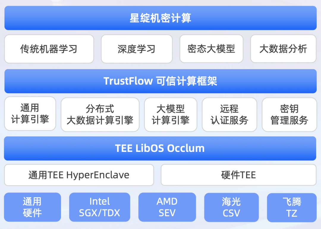 星绽机密计算以HyperEnclave、Occlum和TrustFlow三大核心组件为基础,构建以技术为基石的信任体系。