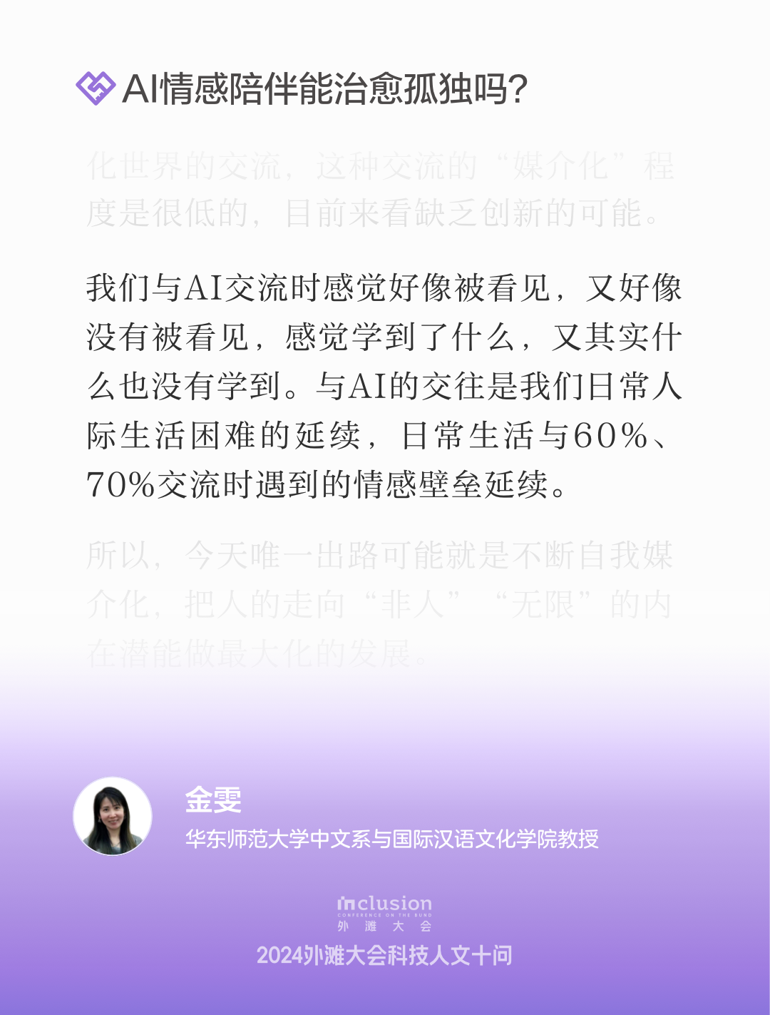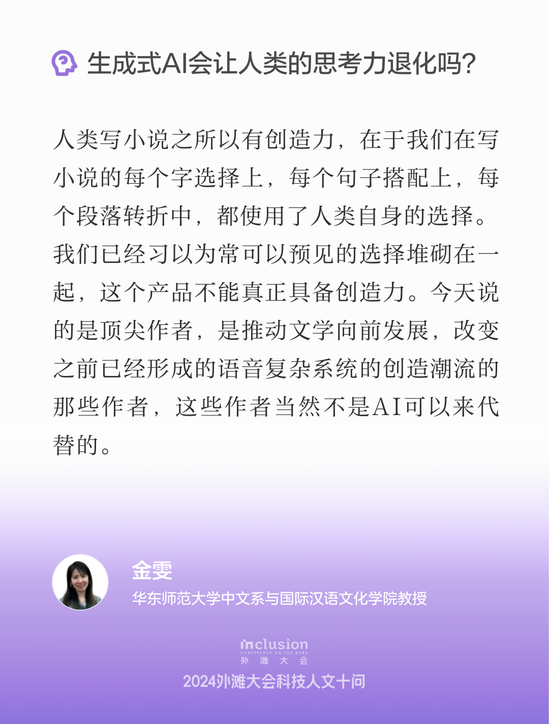 华东师范大学中文系与国际汉语文化学院教授金雯的主旨演讲以“情感与生成式人工智能的瓶颈”为题,重点探讨了自我媒介化在艺术创作中的重要性,揭示AI在艺术创作中面临的瓶颈,指出人类情感和体验在创作过程中的不可替代性。她认为,人类的创造力源于身体作为媒介的独特性,每个感官和神经组织都能传递和管理信息。金雯强调,尽管生成式人工智能能够生成艺术作品,但其缺乏人类情感的深度和复杂性,无法真正体现创造力。她反对将AI与人类艺术创作等同,指出人类的创造力是通过与外界媒介的互动和自我表达而不断扩展的。