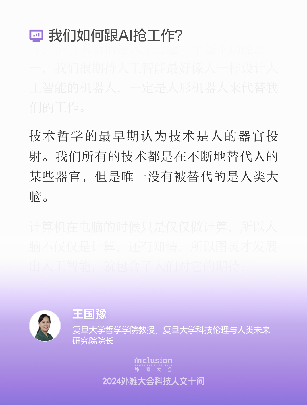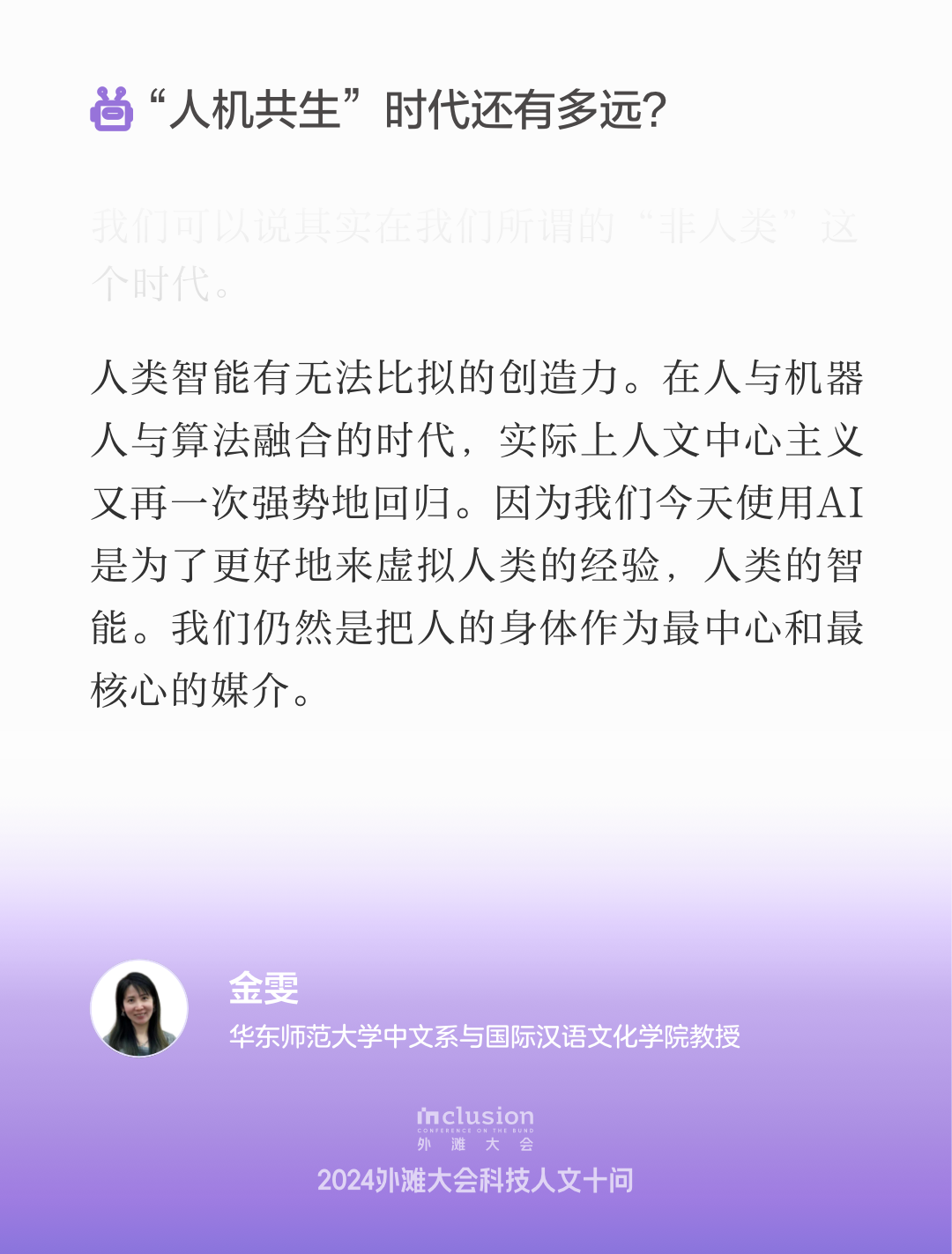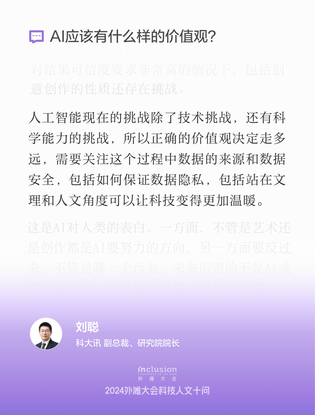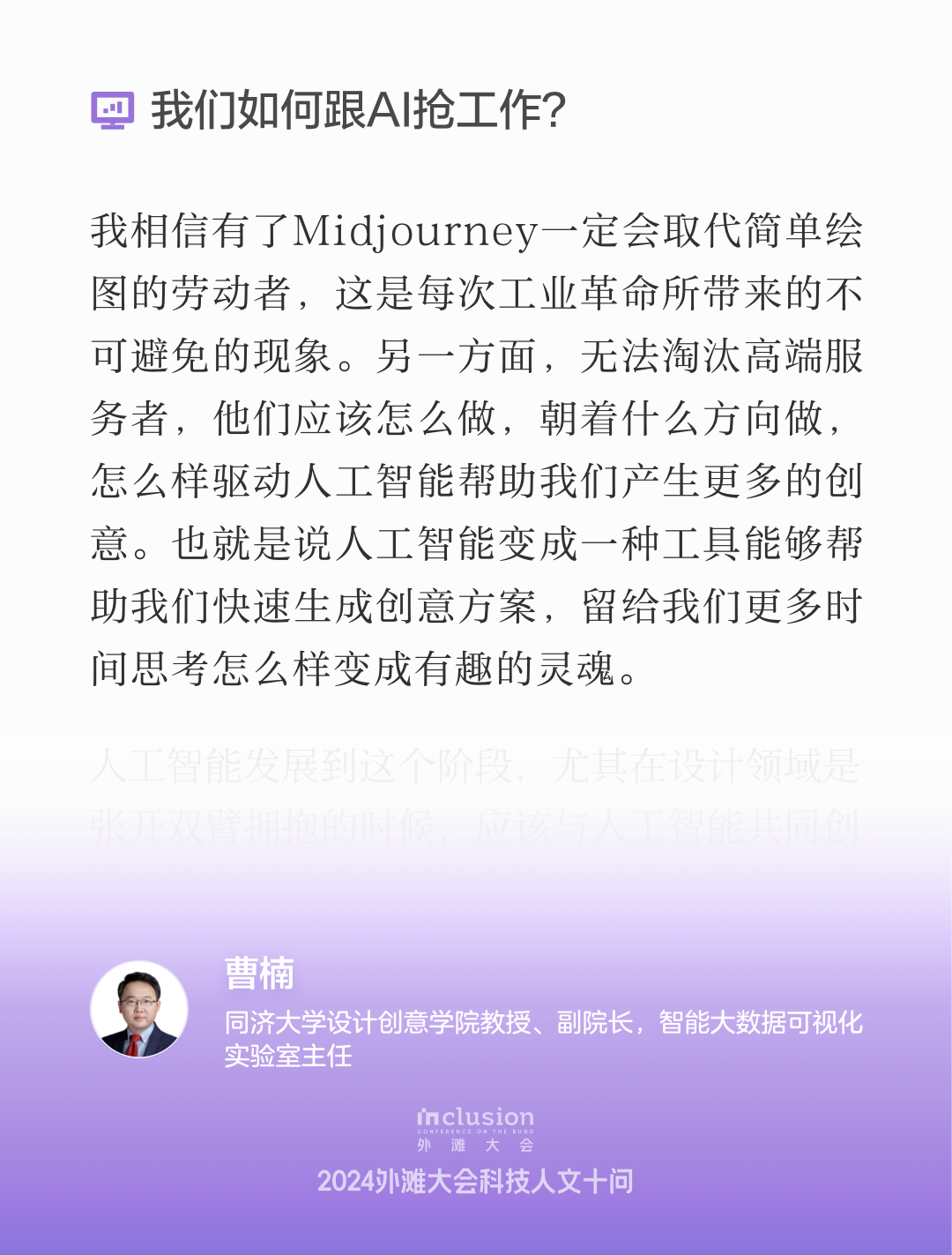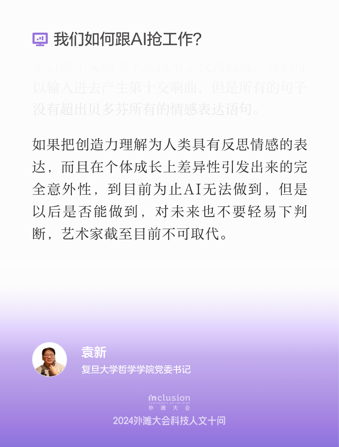 在本次2024 Inclusion·外滩大会“AI时代的创造力”见解论坛中,来自各界的专家学者们围绕人工智能在艺术、设计和社会伦理等领域的影响进行了深入的探讨。与会者们分享了各自的见解,强调了人机共生共享的重要性,以及在技术迅速发展的背景下,如何保持人类独特的创造力和伦理意识。通过开放的对话与交流,大家共同探索了未来的可能性,展现了对AI与人类关系的深刻思考,呈现了一场思维碰撞交织的产学研交流盛会。