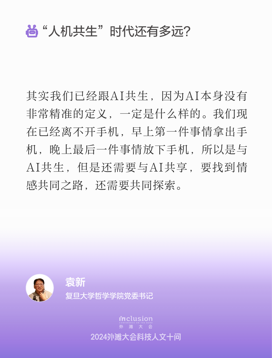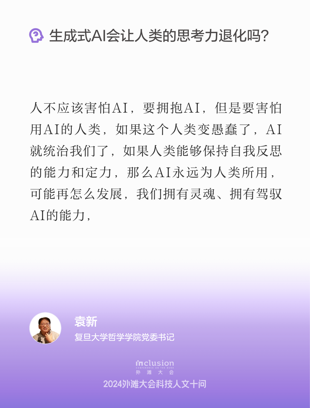 复旦大学哲学学院党委书记袁新在开场致辞中强调了AI在当今社会中的重要性和潜力。他指出,AI的应用为人类提供了前所未有的生存机遇和空间,面对AI的快速发展,社会各界应持开放态度,关注人机共生的可能性,探索如何在技术进步中共享精神价值,以促进人类的美好生活。