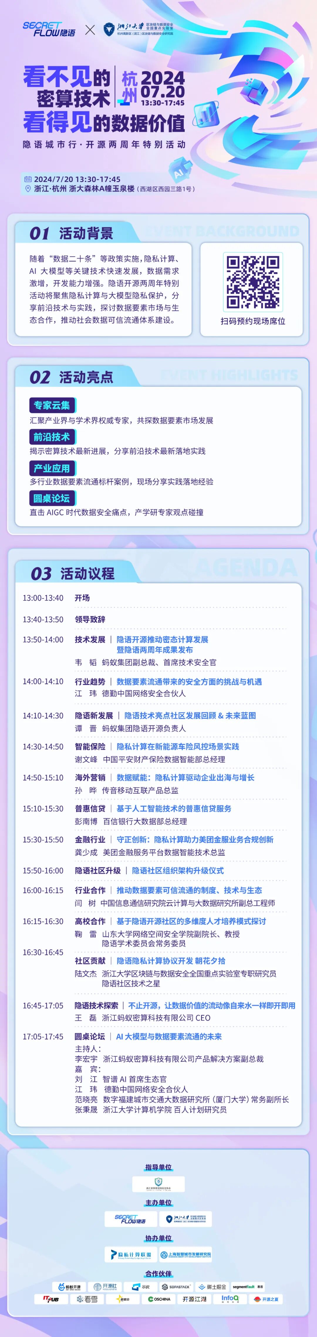 本次活动将聚集来自中国信通院、中国平安、德勤中国、百信银行、美团、传音、浙江大学、山东大学、厦门大学等多个机构的多位产学研专家,从趋势、学术、应用等多维度,围绕隐私计算助力数据要素流通,及AI大模型数据安全保护推进产业应用等议题,从前沿技术到产业落地展开讨论。让数据在保护中流通,在流通中创造价值。
