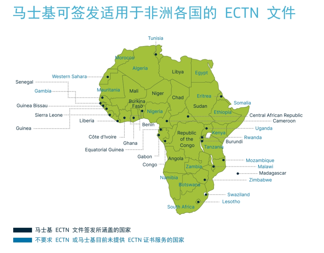 在众多非洲国家,ECTN已成为进口货物清关的关键一环。若未能及时提交ECTN,您的货物可能会遭遇延误,甚至面临高额罚款。因此,对于计划出口非洲的商家而言,申请ECTN不仅是遵守当地法规的必要之举,更是保障货物顺利通关、快速抵达目的地的关键所在。如若您在以下非洲国家及地区开展贸易,需要提供ECTN证书: