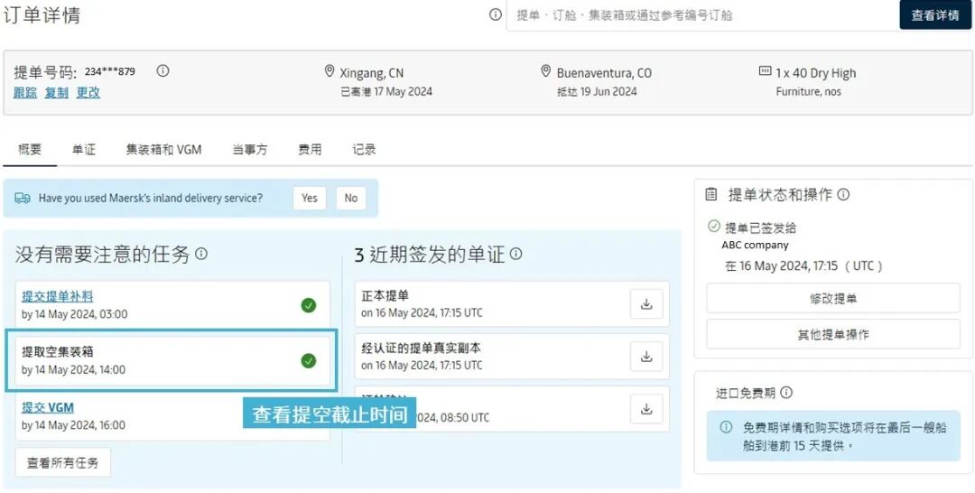 订单详情页“任务/Task” 版块新增 “提取空集装箱/Pick empty container” 截止时间。为了避免您的货物由于晚提箱而影响装船,针对普通货物订舱,请您参考网站上“提取空集装箱/Pick empty container” 截止时间,并及时安排提空。如晚于截止时间提柜,则可能会影响原定装船计划。对于特种货物(Reefer和DG/OOG)订舱,请您按照订舱确认上的时间安排提空箱(或者按照网站上的时间再提前一个工作日)。