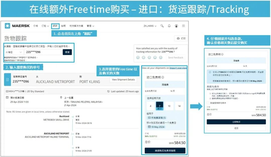 自2024年4月开始,马士基官网在“Tracking/货运追踪”版面新增Free time在线购买渠道,具体规则与其他进口阶段的购买一致: