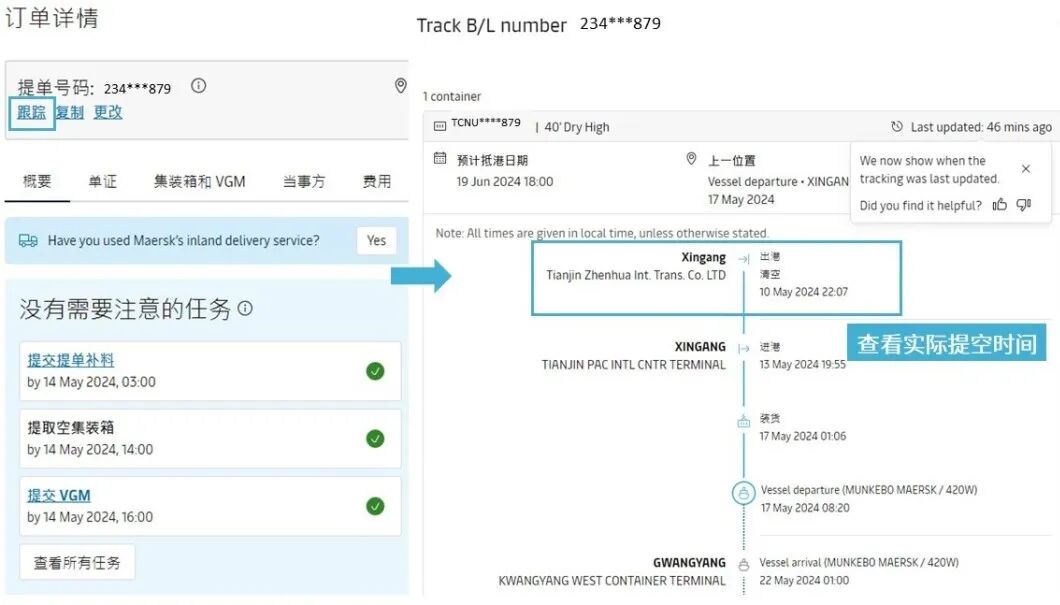 温馨提醒:任务栏中的绿勾“√ ”状态仅代表该任务当前状态是“已完成”,并非指“按时完成”。如需查看实际的提空箱时间,请通过“跟踪”查询,操作示意如下。