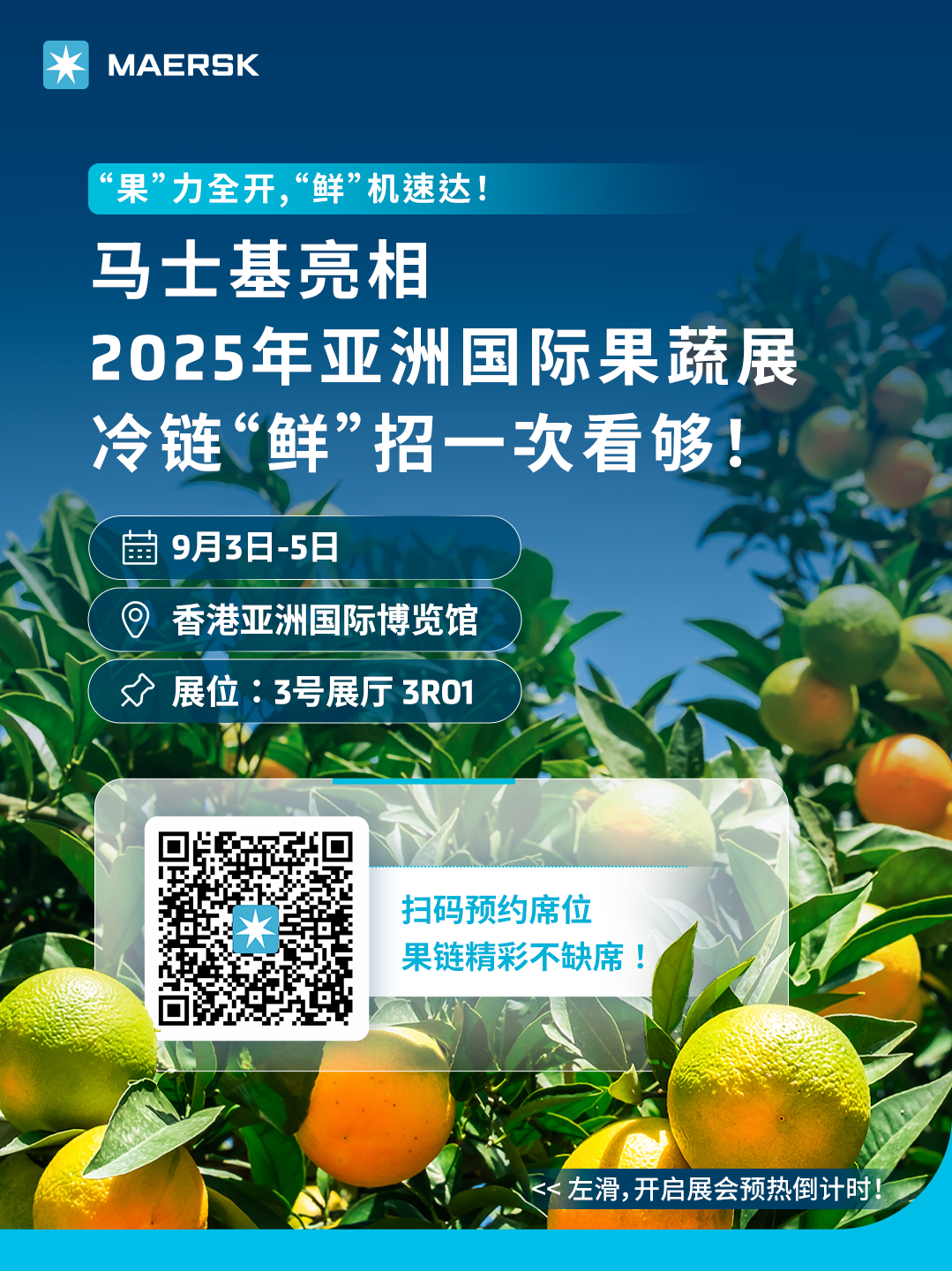 马士基将于2025年9月3 – 5日参加在香港举办的亚洲国际果蔬展览会(Asia Fruit Logistica),欢迎业内合作伙伴届时莅临交流,共探冷链物流新机遇。