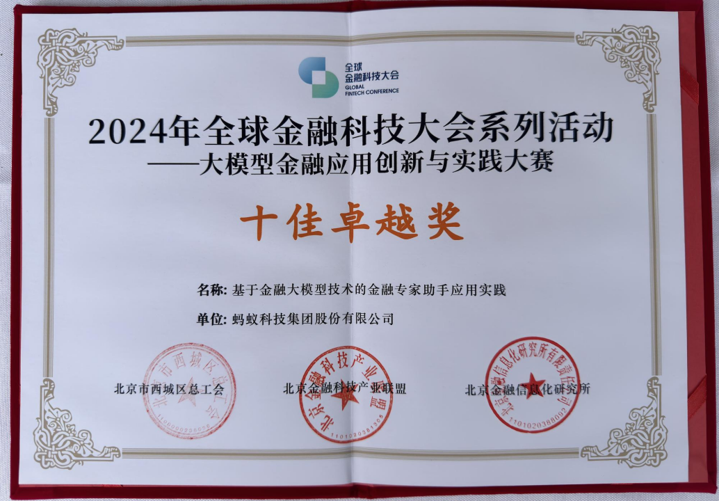 近日,由中关村西城园管委会、北京市西城区总工会、北京金融科技产业联盟、北京金融信息化研究所联合主办的首届“大模型金融应用创新与实践大赛”结果正式揭晓,蚂蚁集团的智能业务助理支小助,获得“十佳卓越奖”。同时获奖的还有工商银行、百度、腾讯等头部金融机构和科技公司。