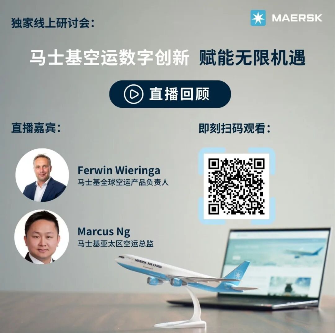在近期举办的马士基空运线上研讨会中,马士基空运专家为大家分享了空运行业的最新趋势,并探讨了数字化创新在空运领域的运用及发展,以及更多关于马士基空运即时报价服务的详情和操作演示。扫描下方二维码,即可观看本次线上研讨会的直播回放,功能趋势尽在掌握!