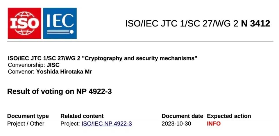 蚂蚁集团联合阿里巴巴、中科院信工所等单位联合推动的ISO/IEC 4922-3(Information security -- Secure multiparty computation -- Part 3: Mechanisms based on garbled circuit )正式通过ISO/IEC JTC 1 SC27的International standard (IS, 国际标准)立项投票,并且高票获得中、日、韩、荷、英、法、爱尔兰、奥地利等8个国家提名专家参与。