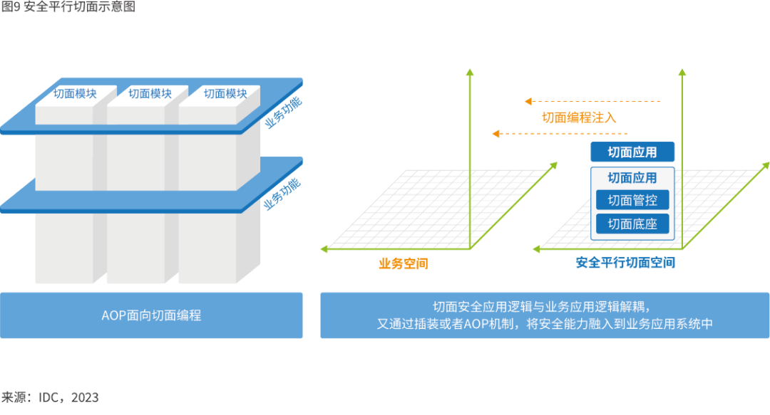 原生安全范式是对安全问题本源的探索,安全平行切面则是支撑未来企业安全架构的重要技术方向,是提升安全防护水平的全新方法体系。二者相辅相成,让安全理念得以落地。从实践层面看,“切面”是面向企业数字生命体的新一代安全基础平台定义,能够通过插桩或者AOP(面向切面编程)机制,将安全能力融入到业务应用系统中,同时又通过将切面安全应用逻辑与业务应用逻辑解耦,实现安全与业务的快速平行迭代。从某种意义上说,AOP是 OOP(面向对象编程)的重要补充,两者相互影响,彼此延伸。