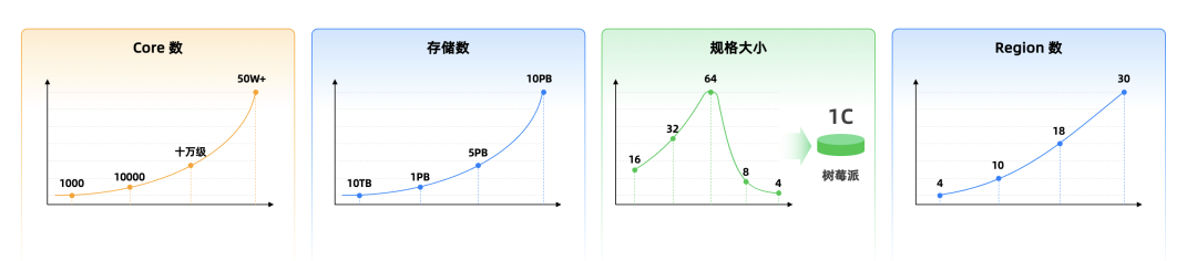 在 2023 年度产品发布会上分享了 OB Cloud 四大成长:云上总集群所使用的 CPU 核数目前达到了 50 万 Core 以上;存储数从 10TB 发展到了 10PB 级别;产品规格从最高 64C 下探到 4C;在提供服务的 Region 数量上达到 30。