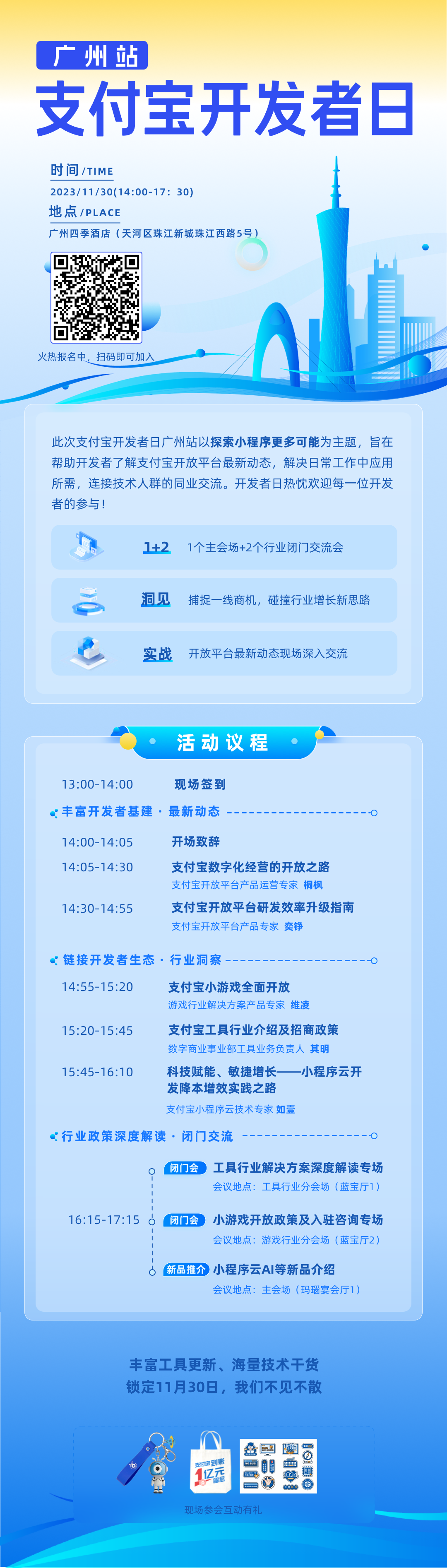 支付宝开发者日·广州站诚挚邀请各位参与,本次活动将分享支付宝数字化经营工具和多种能力介绍,助力服务业实现数字化转型、支付宝开放平台研发效率指南、支付宝小游戏全面开放、支付宝工具行业介绍及小程序云产品介绍及案例实践,探讨开放平台技术工具迭代,探索小程序的未来更多可能。